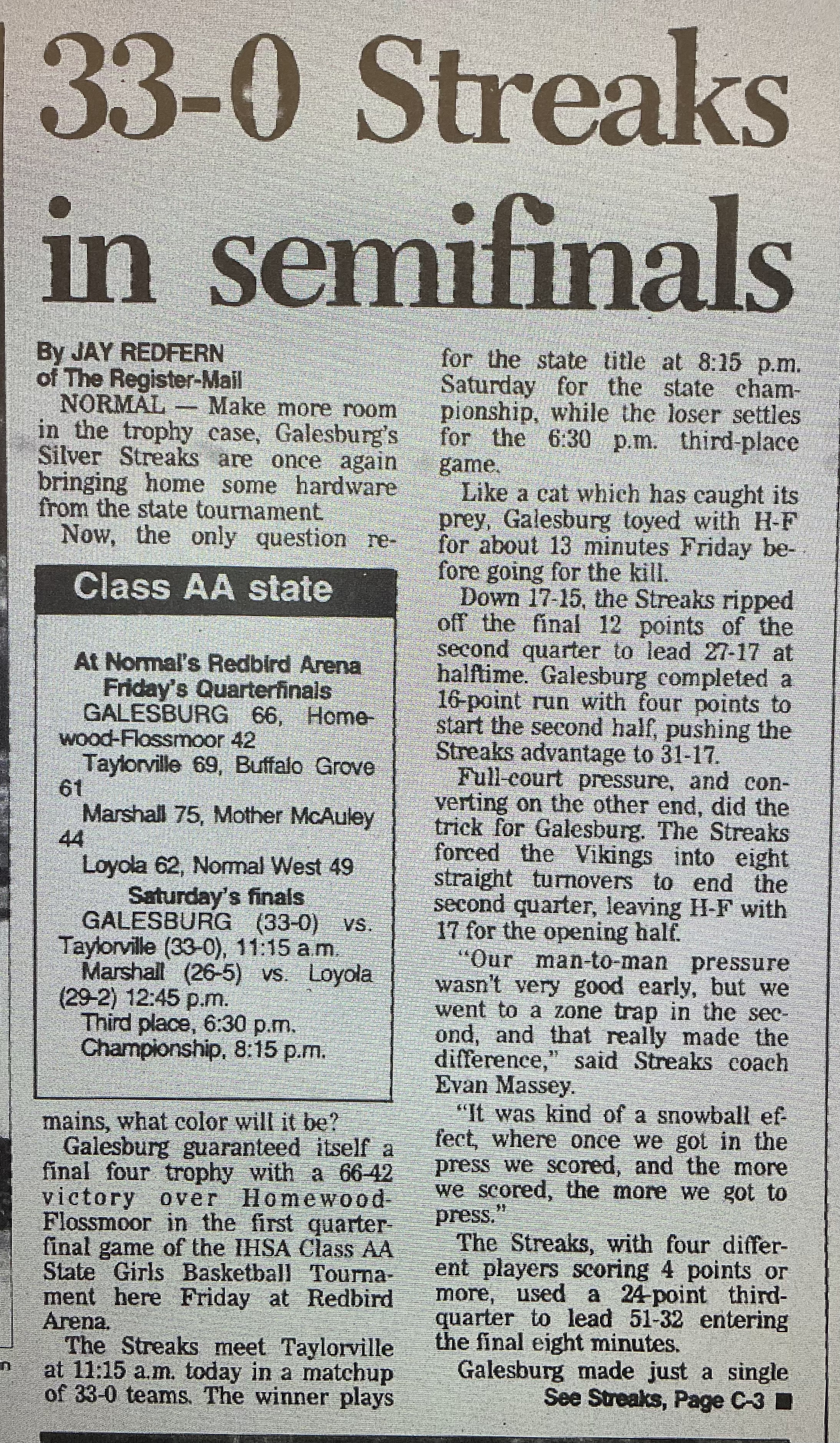It was a game the Streaks felt let slip away. Galesburg running flat lost to Chicago Marshall 80-61 for third place. Loyola behind sophomores, Olga Gvozdenovic, Sobiezchzyk, and Fletcher defeated Taylorville 67-61 for the State Title.